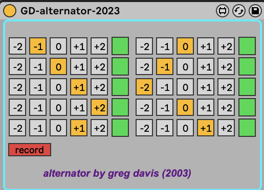 gd-alternator is a Max For Live device that I originally created in the Max/MSP Pluggo environment around 2003 & updated for M4L in 2023. It snatches up to 10 short slices from the incoming audio & pans them alternating hard left and right to create hypnotic textures. You can control the octave & mute of each slice. You can also start / stop the recording of the incoming audio in order to freeze what you have captured.