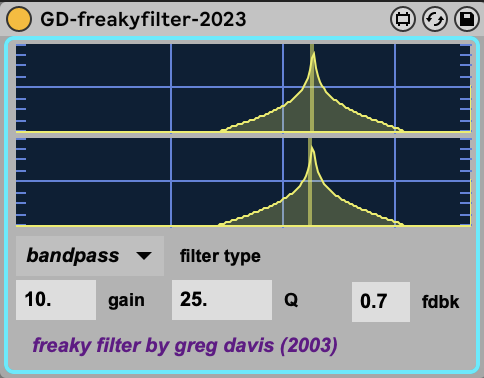gd-freakyfilter is a Max For Live device that I originally created in the Max/MSP Pluggo environment around 2003 & updated for M4L in 2023. The incoming audio triggers random values for the left and right filter frequencies as well as delay times. You can control the filter type, gain, Q and feedback level of the delays. It creates cool, stuttering filtered textures. I really like using the bandpass or highpass filter types.