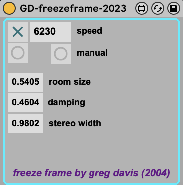 gd-freezeframe is a Max For Live device that I originally created in the Max/MSP Pluggo environment around 2004 & updated for M4L in 2023. It uses a crude reverb to freeze the incoming audio at a set interval. The plugin automatically crossfades between two frozen reverbs. The time interval (speed) also determines the randomization of the room size, damping and stereo width.