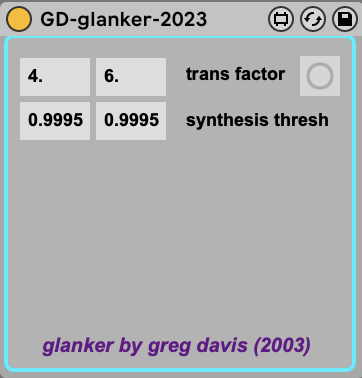 gd-glanker is a Max For Live device that I originally created in the Max/MSP Pluggo environment around 2003 & updated for M4L in 2023. It uses a crude phase vocoder to resynthesize the incoming audio based on the threshold setting. You can transpose the resynthesis as well.