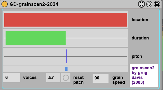 gd-grainscan2 is a Max For Live device that I originally created in the Max/MSP Pluggo environment around 2003 & updated for M4L in 2024. This is a variation on my grainscan1 plugin. Its another flavor of granular synthesis. I kept the controls a little oblique on purpose for this one, that is meant to encourage maybe a different kind of exploration. Each parameter has a range slider that you can use to select a value, some portion or all of the range. Use shift-click to set the high and low values for each range, use command-click to slide a range up or down. Location is where in the incoming audio buffer will be processed, Duration is the size / length of the grains, Pitch is the pitch of the grains, the slider below the range bar will move up and down the chromatic scale. Voices sets the number of grains & grain speed sets the speed of the granular engine. Experiment and have fun with it!