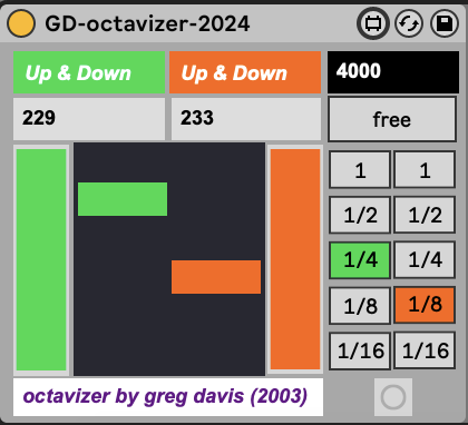 gd-octavizer is a Max For Live device that I originally created in the Max/MSP Pluggo environment in 2003 & updated for M4L in 2024. This takes the incoming audio and pitches it up & down octaves. Each channel is independent & you can control the direction and the speed of the octave changes. It can run in free mode with separate tempo settings or tempo mode which is synced to the Ableton tempo with subdivisions for each side. There are also range filters for limiting the number of octaves on each side. (the button on the bottom resets the ranges back to full) And finally, the black number box in the upper right corner sets the buffer length. Play around with different buffer sizes for surprising effects.