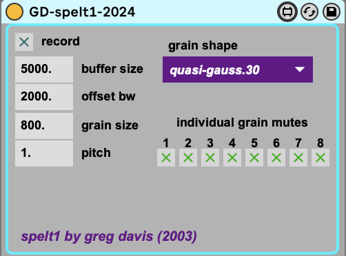 gd-spelt1 is a Max For Live device that I originally created in the Max/MSP Pluggo environment around 2003 & updated for M4L in 2024. This is yet another flavor of granular synthesis. Controls for buffer size, offset bandwidth, length of grain, grain shape & pitch. Alternate grains can be good for you!